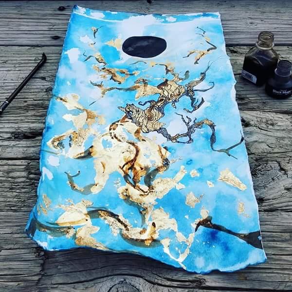 Another start; Gold Leaf, watercolor, ink and lots of sky. I’m going with a more vertical composition this time.