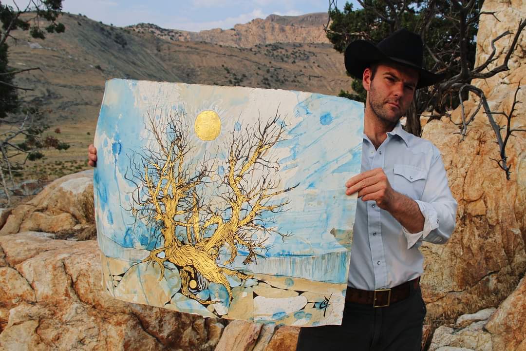 Finished! often use gold leaf. It reminds me of the sun and the radiance of the desert, and oddly, of an encounter I had with a homeless man and his dog when I was working for the Forest Service. He had been living on the forest for some time, and I periodically stopped in at his camp to tell him that it was time to move on. He was a large guy, mostly pleasant and usually very drunk. His camp was decorated with many empty bottles. I was never too stern with him even though it was a popular camping area. He always promised me he would be leaving shortly, but he and his dog ended up living there for over half the summer. The last time I spoke to him the sun was shining down through the leaves and branches above him, defused through the hanging smoke of his camp fire. He stumbled up to my truck, a yellow lab in tow. When he reached me, he leaned in my window, holding himself up with one hand on my truck while the other clung to a large mostly empty bottle. The dog jumped up on its hind legs against my door. The man spoke loosely and loudly, reassuring me again that he was leaving soon. I remarked that the dog looked happy. At this pronouncement, he turned a focused gaze directly at his dog, his eyes intense and transfixed. Looking into her eyes, he said, “Pure gold, her eyes are pure gold.” And it was true. I have never seen eyes quite like them—or like his in that moment, a moment as gold as the eyes themselves. I understood this was a moment of brilliance and light, which is the essence of art. He was gone the next day and later that Summer I learned that the man had passed away.As the poet said, “nothing gold can stay.” But we have our moments. (Born of Rock and Sun) Gold leaf, watercolor, ink, coffee and tea on paper. 33×23″