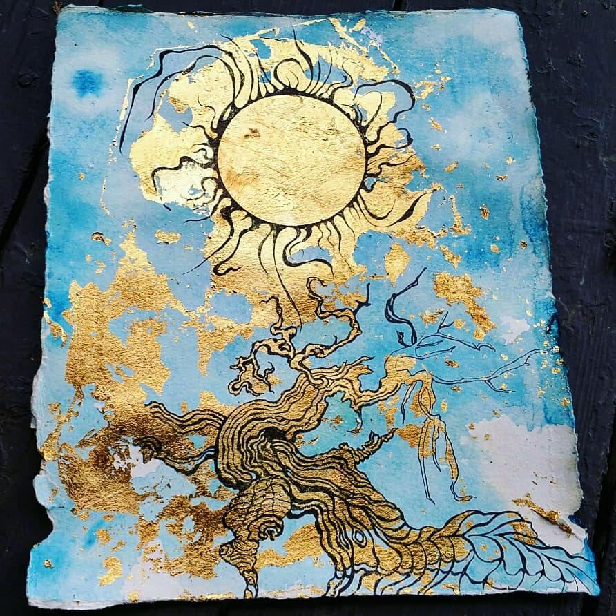 Work in progress… Untitled, Gold leaf, blue dye, and ink on coffee&tea paper. 10×12″