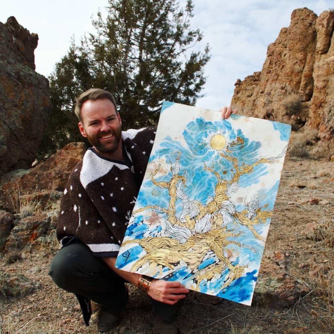 All done! While searching for the perfect backdrop for a photo with my recently finished drawing, I found myself walking along a ridgeline scattered with lichen covered stones and junipers. After setting up for the shot, I dropped low to the ground with my drawing and noticed what looked like a tiny flake of dark glass between my boots. I picked it out of the dirt and to my great surprise, saw it was an obsidian arrowhead! Right under me was a piercing reminder of how alive the desert is, a reminder that I’m just a visitor lucky enough to roam this paradise. This moment was more amazing considering I had drawn projectile points throughout this work, and titled it ” Flint, Juniper, Sky”. After a few photos I placed the petite artifact back where it was laying, pondering my place in relation to the tryptic of “Flint, Juniper, Sky”Gold and silver leaf, ink, coffee and tea, and watercolor on paper. 22×30”