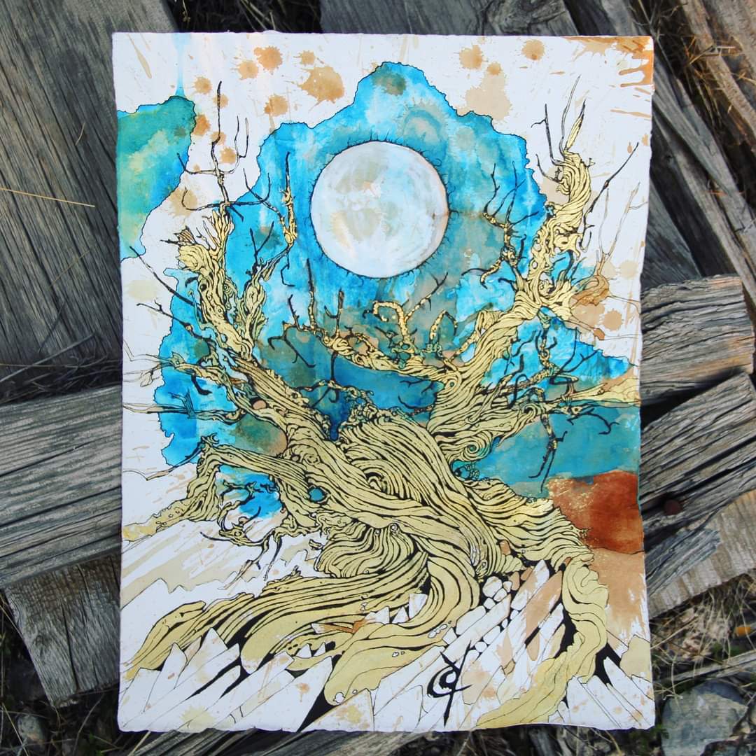 Just finished up this drawing! It seems to me that the Juniper is always reaching for some celestial body—Longing for an embrace like the touch of someone very special who has gone from our lives. Juniper Moon: Gold leaf, ink, blue dye, and coffee on paper. 5×15″