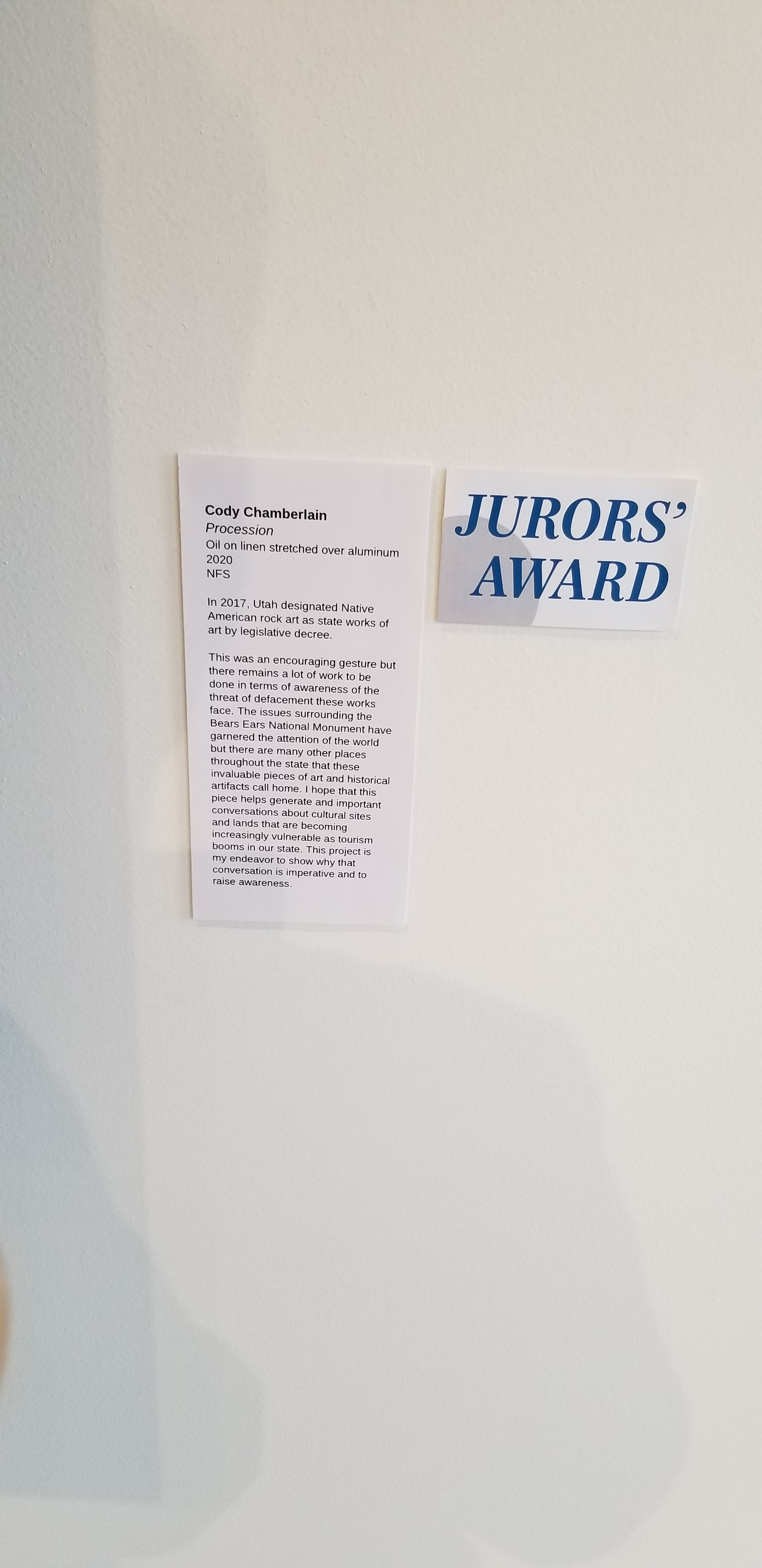 I was honored to receive a Jurors’ Award in The Utah Division of Arts & Museums Statewide Annual Exhibition, and eager for the opportunity being in the show affords me to advocate for the preservation of sensitive cultural and archeological sites. Procession was a work born from the strong and lasting impression a petroglyph panel housed in the gallery of the great outdoors can make. Utah has made some gestures towards protecting some sites but there is still so much work that needs to be done. The beautiful scene I painted is one of many that are in daily peril of defacement in Utah. Preserving our state’s earliest art works is crucial and whether we make the choice to do so speaks to our values. How important is art and history to us? I can’t think of a better partnership for exploring those questions than one with the Division of Arts & Museums. Come out and see the show. This year the exhibition is at the Ogden Contemporary Arts Center, and runs through January 6th. It is full of stimulating and thoughtful work from some of the finest visual artists in Utah.