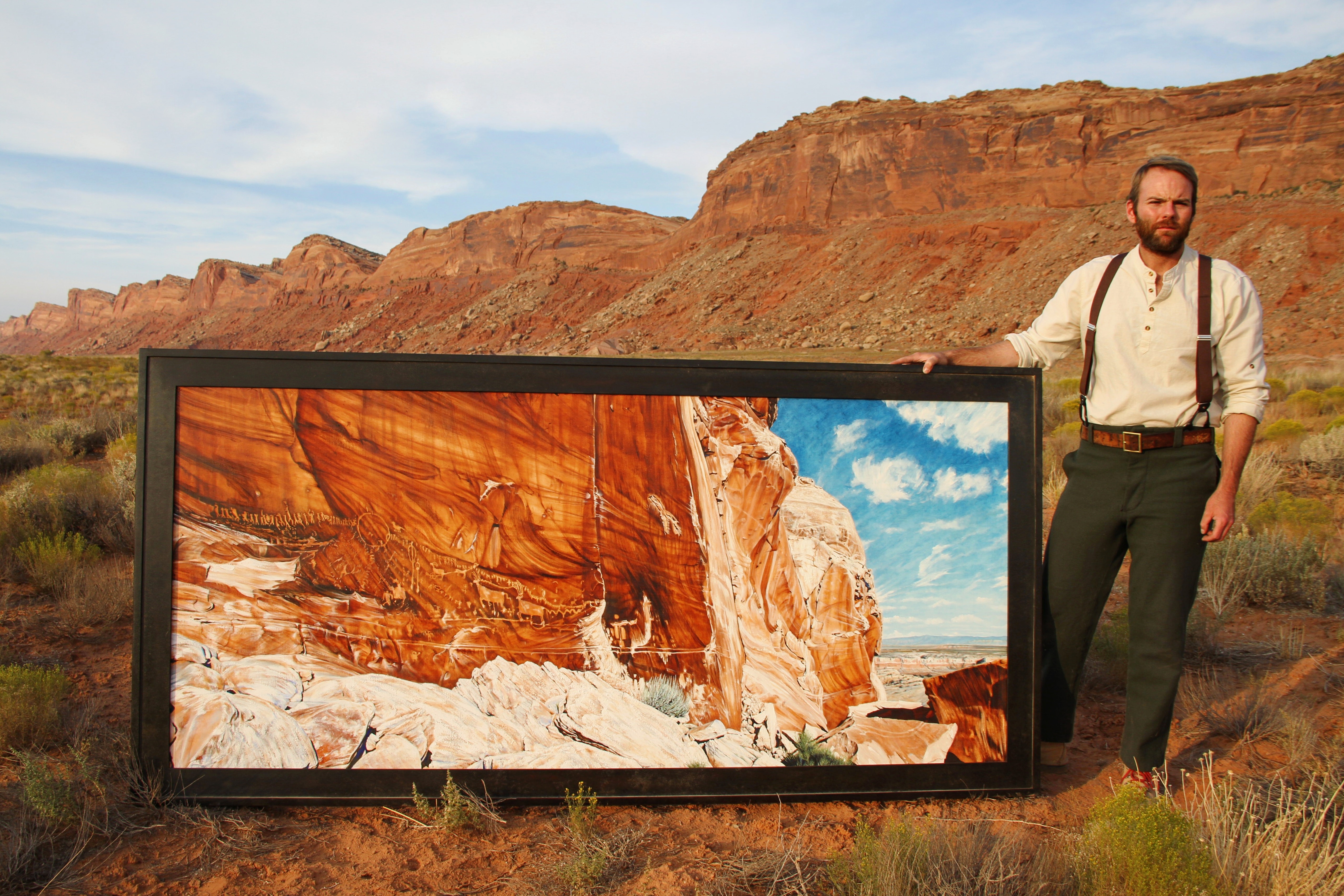 Unveiling! After all the blood, sweat and tears I’ve put in to this painting, my soul is realigned with the cliffs, the clouds and people I hold dear. Human history is interwoven with the earth’s geology like a maze with no end. With paintbrush in hand, I’ll explore that connection, finding my way through the wilderness. “Procession” Oil on linen, 94×42″